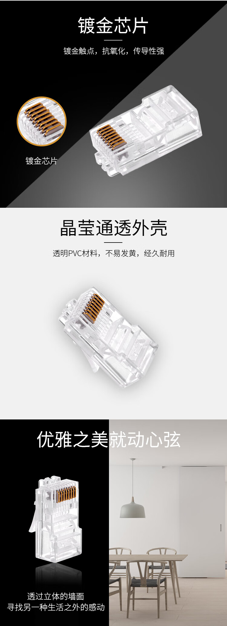 符合TIA,ISO标准对于组件性能的要求。利用一个小的排线管,方便排线与端接。 排线管用于保证线缆绞距,现场端接或工厂批量生产均可。 100个/包 特性: 规格: 外皮透明 颜色: 8-554720-3 型号: 超五类网络水晶头 名称: 添加文字 基本参数 传输稳定 下载更多 — 看片流畅 — 游戏不卡 开启光速网络时代 产品功能 产品特点 适用场景 产品实拍
